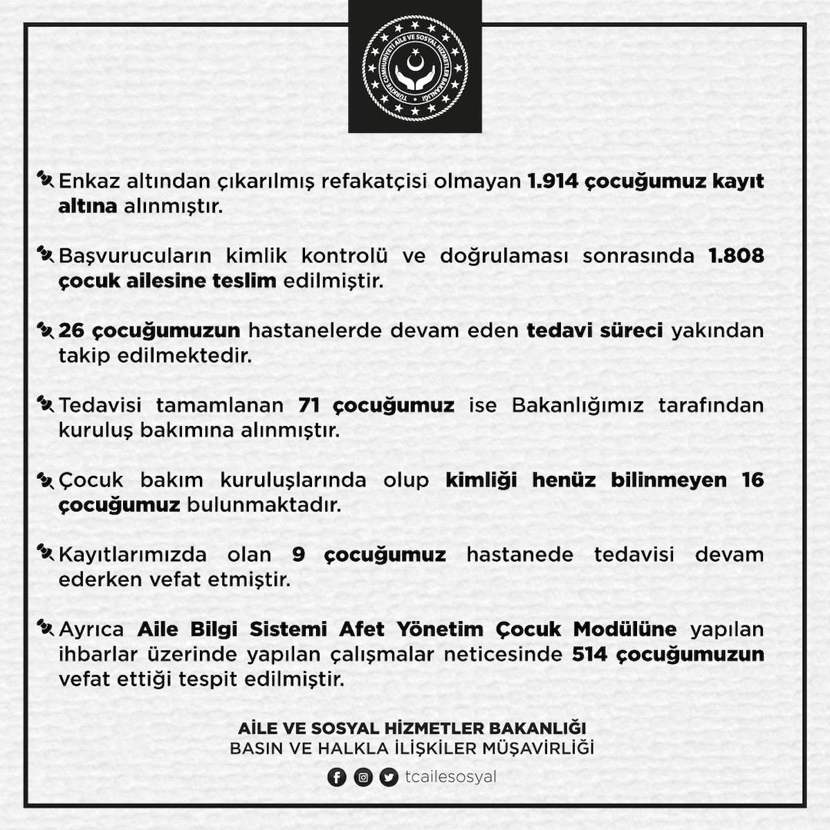 Bakanlık kayıtlarında olan 9 çocuğun hastanede tedavisi devam ederken vefat ettiği ayrıca Aile Bilgi Sistemi Afet Yönetim Çocuk Modülü'ne yapılan ihbarlar üzerinde yapılan çalışmalar neticesinde ise 514 çocuğun vefat ettiğinin tespit edildiği bilgisi verildi.