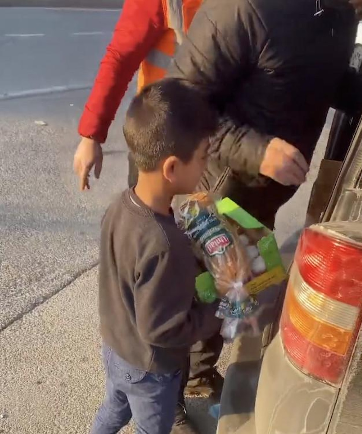 İki kez üsteleyerek ihtiyacı olanlar için ekmeği zorla bırakan çocuk, yardım dağıtan ağabeyi tarafından çikolata ile ödüllendirildi.