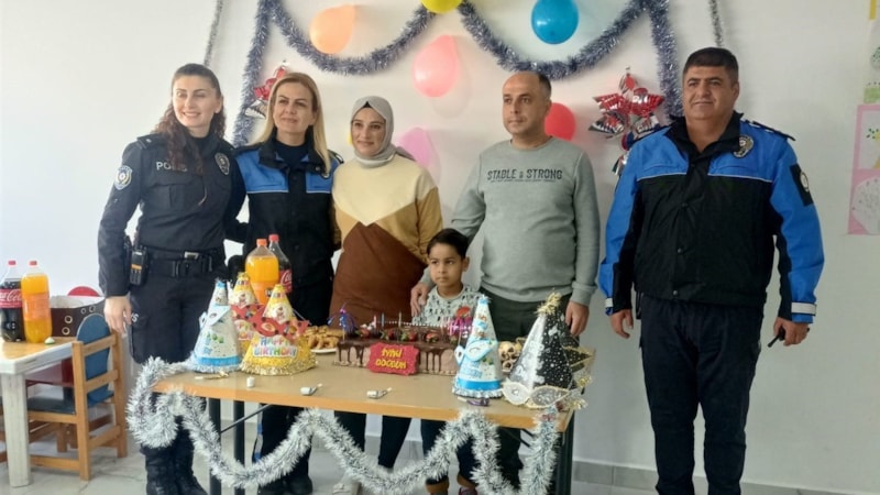 Gazipaşa İlçe Emniyet Müdürlüğünde görevli polisler koordinesinde yapılan kutlamaya, Miraç’ın ailesi ile diğer afetzede çocuklar da katıldı.