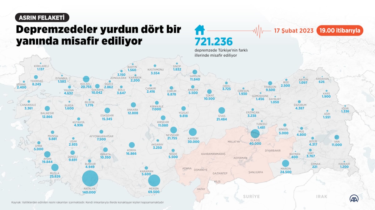 Adıyaman ile kardeş şehir olan Aydın'da 19 bin 844, Konya'daki yurt ve kamu misafirhanelerine 16 bin 866, Van'daki ev, otel, yurt ve kamu kurumlarının misafirhanelerine 11 bine yakın kişi yerleştirilirken, Eskişehir'de 15 bin 345, Balıkesir'de 12 bin 866, Kırşehir'de 11 bin 80, Samsun'da 10 bin 840, Tokat'ta 10 bin 500, Isparta'da 10 bin 350, Sakarya'da 10 bin 42 kişi misafir ediliyor.