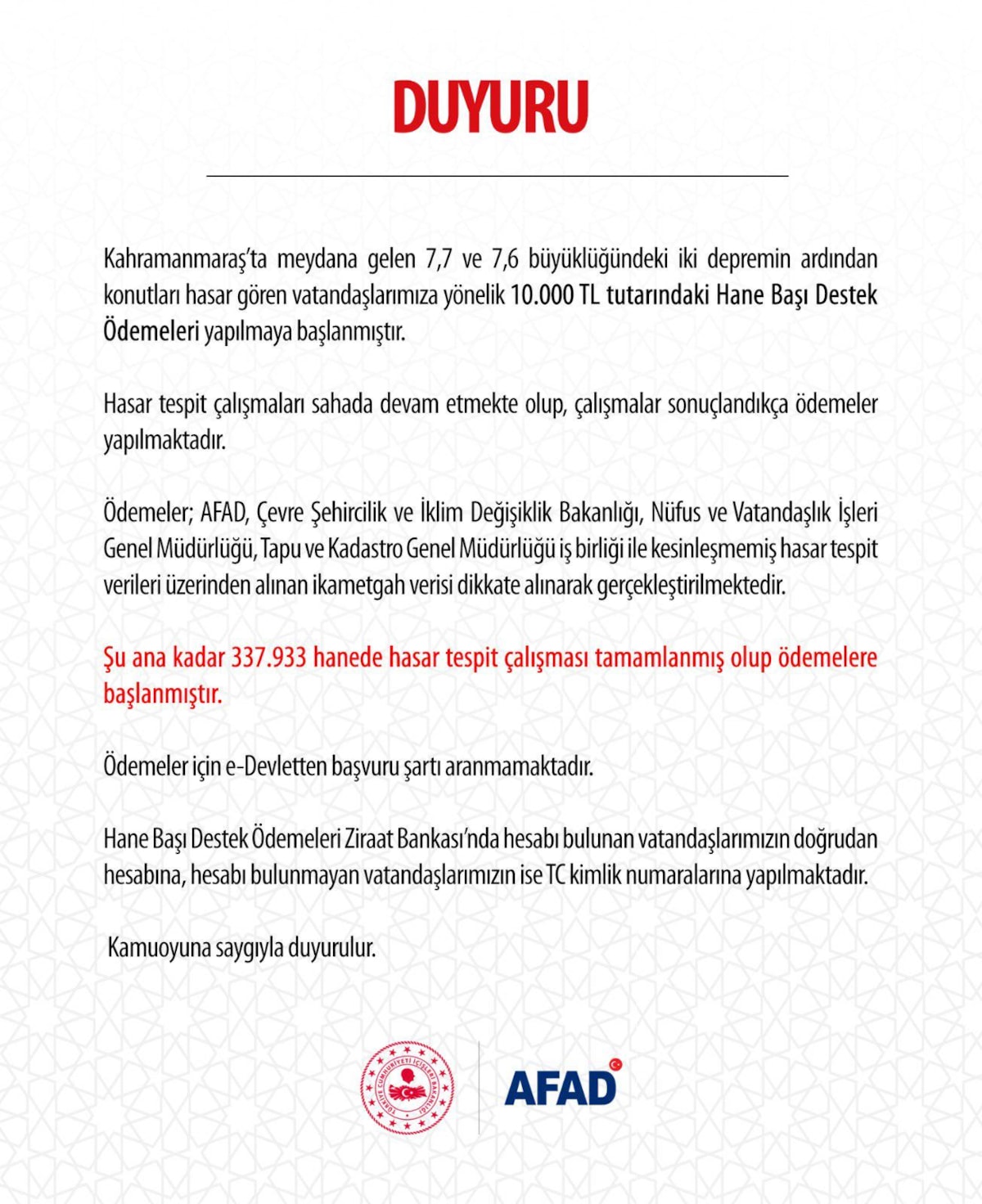 Ödemelerin AFAD, Çevre, Şehircilik ve İklim Değişikliği Bakanlığı, Nüfus ve Vatandaşlık İşleri Genel Müdürlüğü, Tapu ve Kadastro Genel Müdürlüğü iş birliği ile kesinleşmemiş hasar tespit verileri üzerinden alınan ikametgah verisi dikkate alınarak gerçekleştirildiği belirtilirken, şu ana kadar 337 bin 933 hanede hasar tespitin tamamlanarak ödemelere başlandığı duyuruldu.
