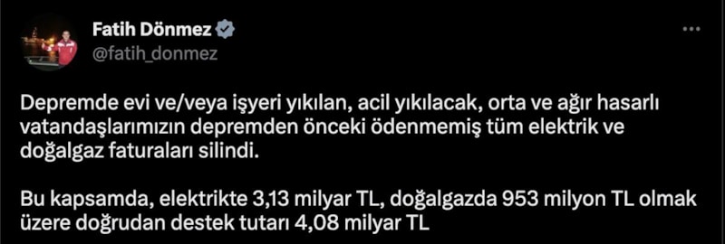 “Bu kapsamda, elektrikte 3,13 milyar lira, doğalgazda 953 milyon lira olmak üzere doğrudan destek tutarı 4,08 milyar lira. Adıyaman, Hatay, Malatya ve K.Maraş’ın tamamıyla G.Antep'in İslahiye ve Nurdağı ilçelerindeki depremde zarar görmeyen yüksek tüketimli sanayi ve ticarethane aboneleri haricinde tahakkuk ve tahsilatlar da 31 Mayıs’a kadar ertelendi.”