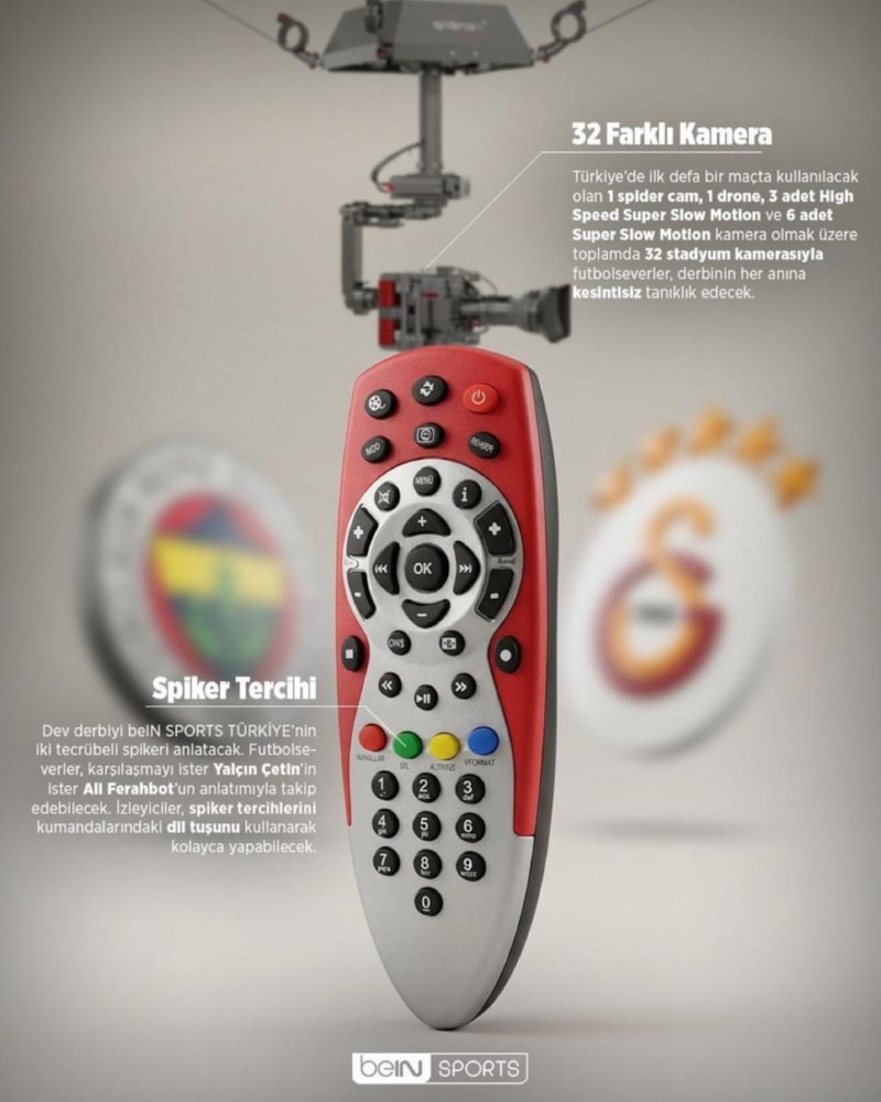 Ayrıca 1 örümcek kamera, 1 drone olmak üzere toplam 32 kamerayla, derbi ekranlara yansıyacak.