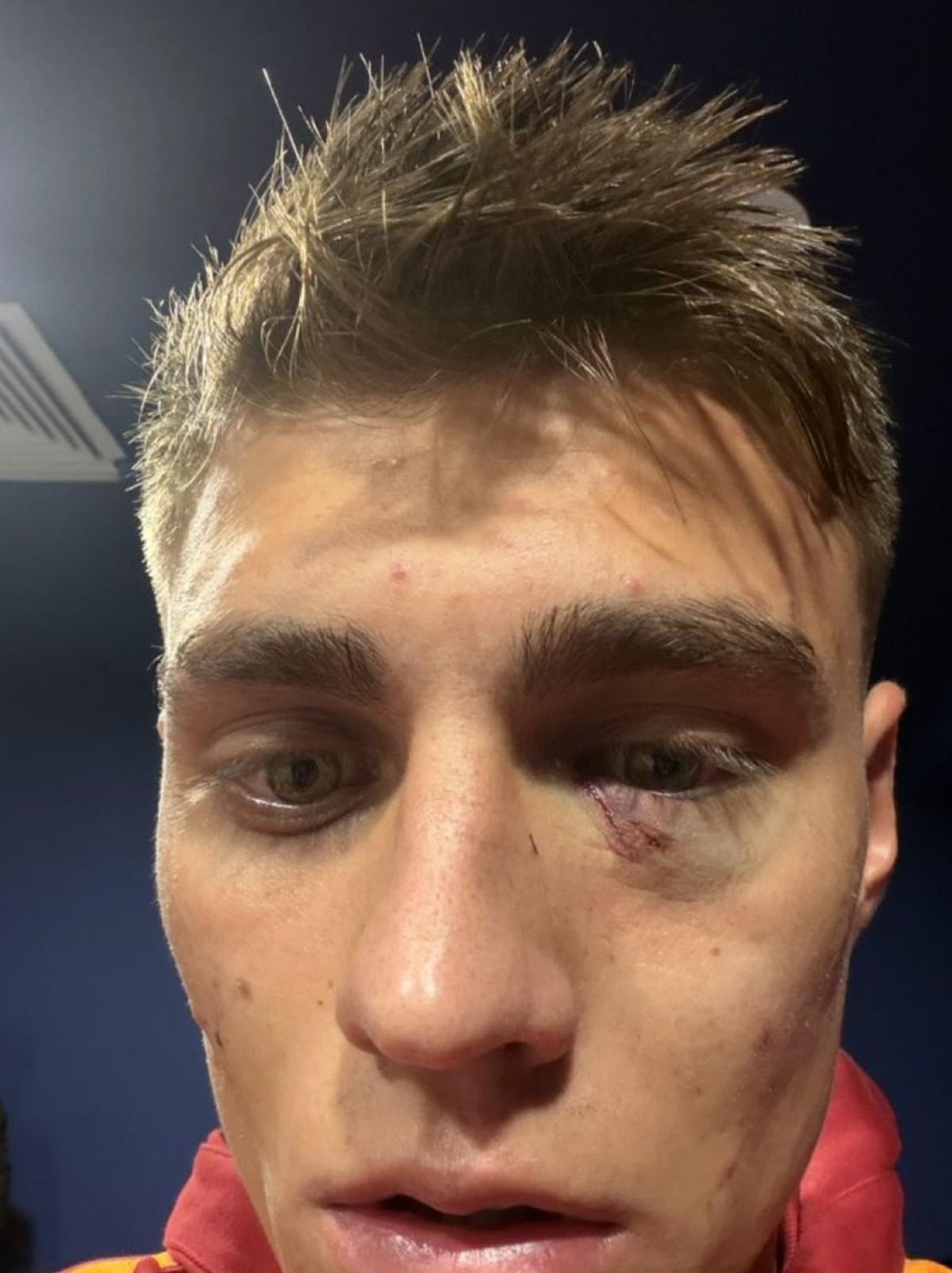 Galatasaray'ın gol sevinci sırasında tribünden atılan bir yabancı madde, futbolcu Kazımcan Karataş'ı yaraladı.