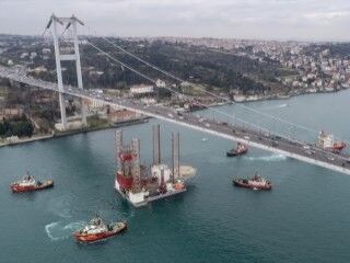 GSP Saturn ismindeki dev petrol platformu, İstanbul Boğazı'ndan geçiş yapıyor. Köprüler ve boğazı daha rahat geçebilmek adına kuleler indirilirken boğazdaki gemi trafiği de durdu.