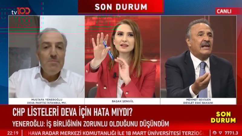 DEVA Partisi İstanbul Milletvekili Mustafa Yeneroğlu'nun katıldığı canlı yayında partisinin seçime CHP listesi yerine tek başına girmesini gerektiğini söyledi. Bunun üzerine sinirlenen Mehmet Sevigen "CHP'yi beğenmiyorsanız, oylarından rahatsız oluyorsanız istifa edin" dedi.