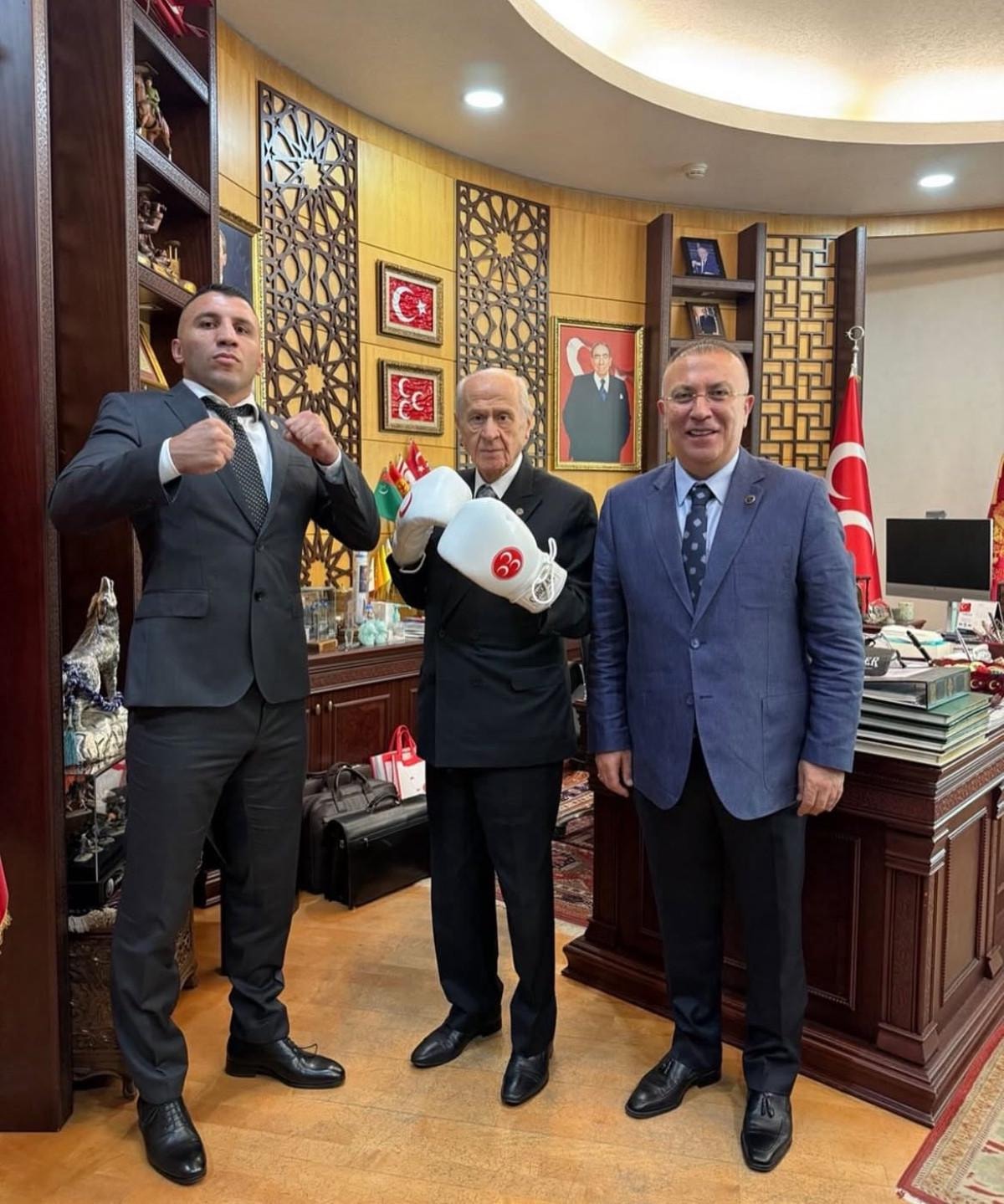 - Görüşmenin sonunda Bahçeli, boks eldivenlerini takarak hatıra fotoğrafı çektirdi.