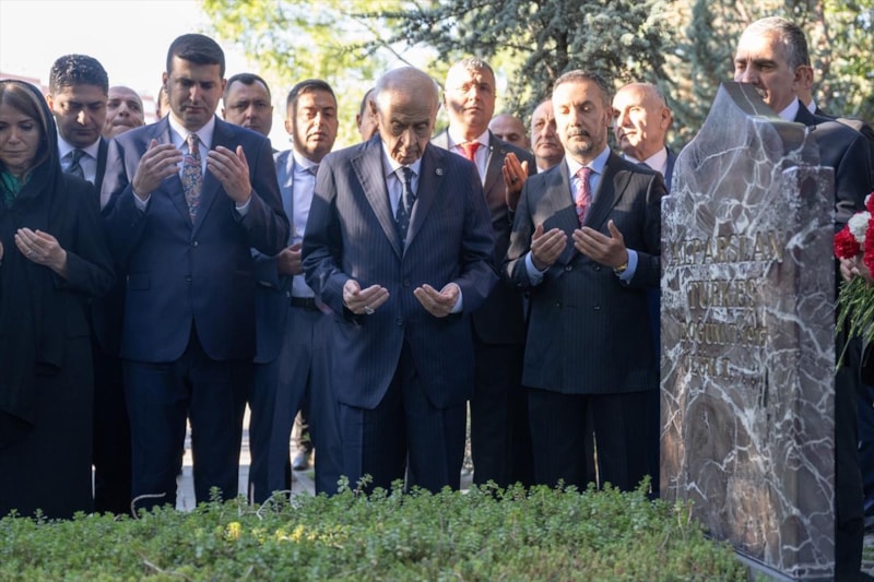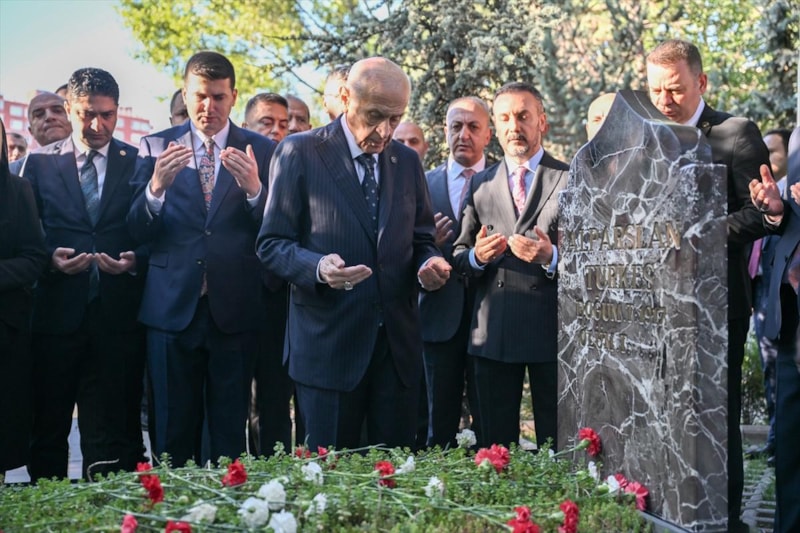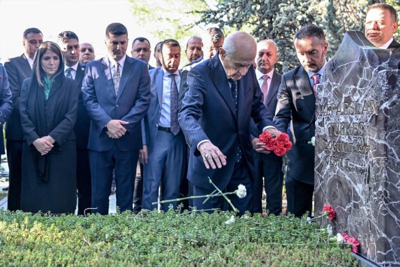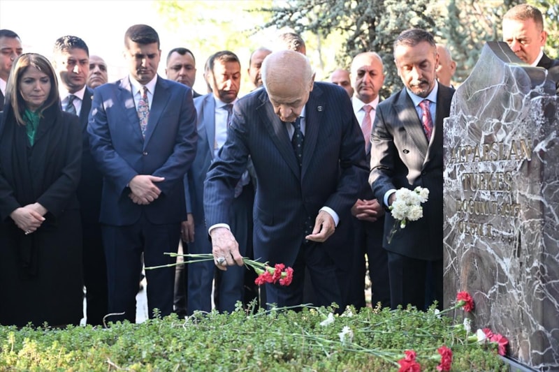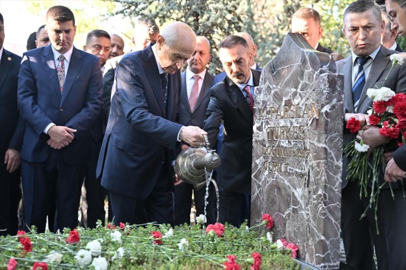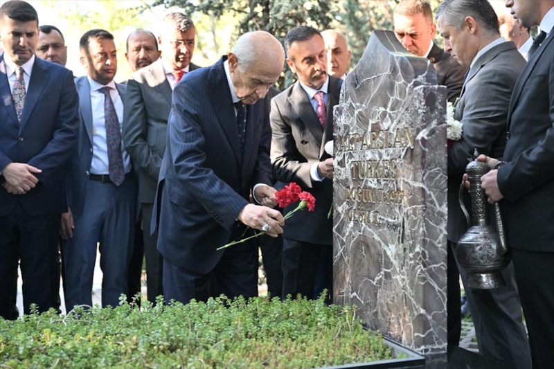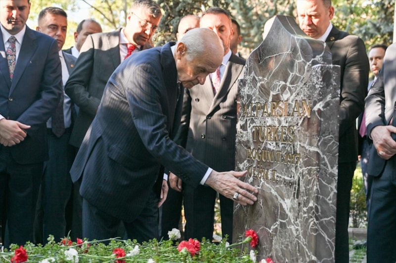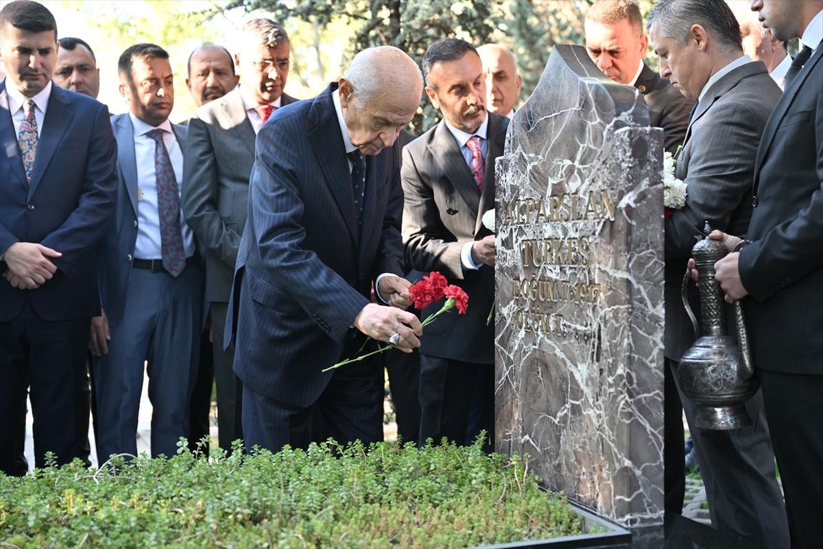 Bahçeli, burada okunan Kur’an-ı Kerim tilavetinin ardından Alparslan Türkeş’in kabrine kırmızı beyaz karanfil bıraktı, bakır ibrikle su döktü.
