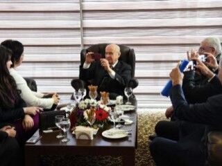 Genel Başkan Devlet Bahçeli fotoğraf çekerken, genel başkan yardımcıları Edip Semih Yalçın, İsmet Büyükataman ve Mehmet Günal da cep telefonu kamerasıyla kendisinin fotoğrafını çekti.