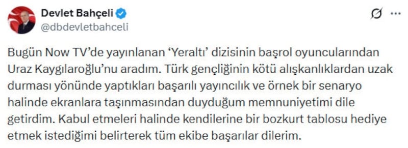 MHP lideri Devlet Bahçeli, 'Yeraltı' dizisinin başrol oyuncularından Uraz Kaygılaroğlu'nu arayarak bölümlerde Türk gençliğine yönelik verdiği mesajlarından memnuniyet duyduğunu ve kendisine bozkurt tablosu hediye etmek istediğini söyledi.