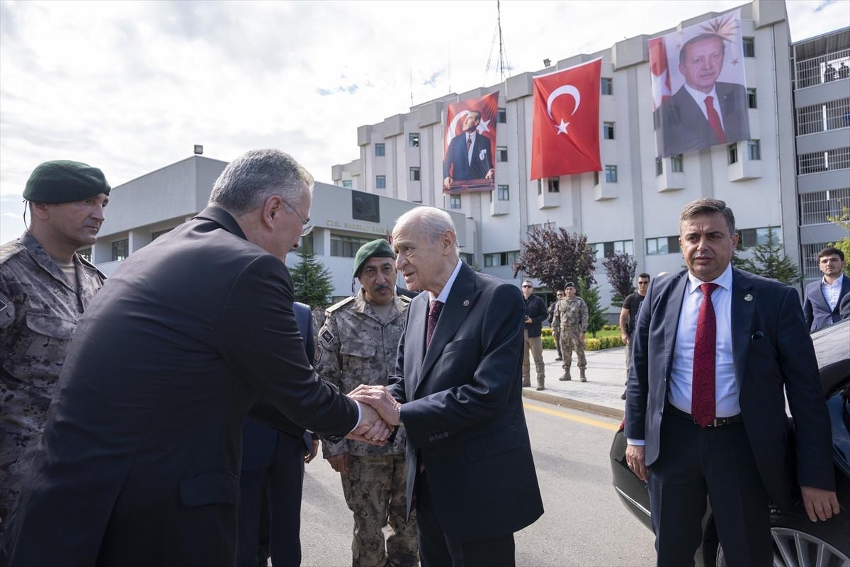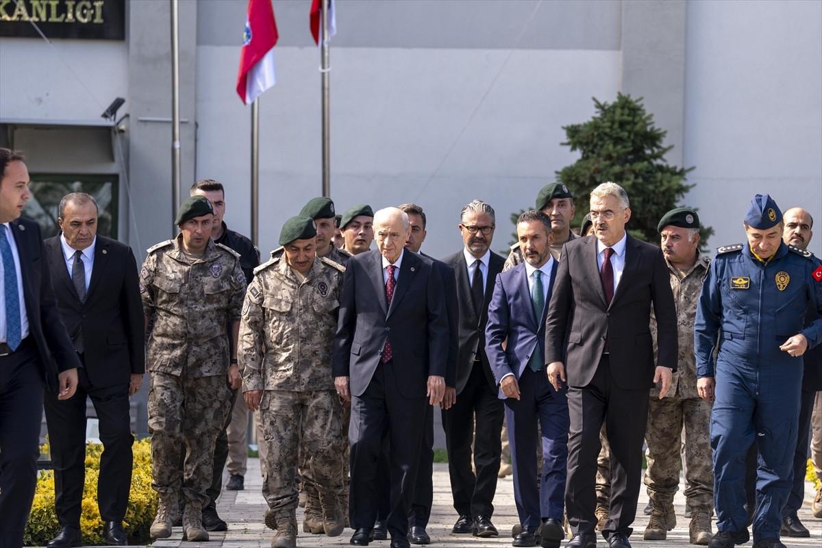 Özel harekat polislerini selamlayan Bahçeli, Ayyıldız ve beraberindekilerle bir süre görüştükten sonra yerleşkeden ayrıldı.