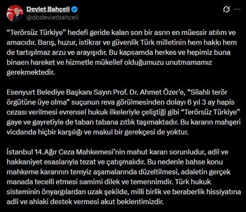 Mahkemenin verdiği 6 yıl 3 ay hapis cezasını eleştiren Bahçeli, kararın evrensel hukuk ilkeleriyle çeliştiğini ve “Terörsüz Türkiye” hedefiyle taban tabana zıt olduğunu savundu.