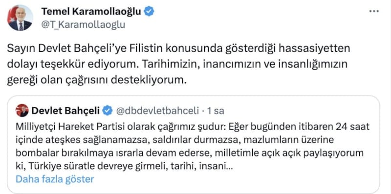 Sayın Devlet Bahçeli’ye Filistin konusunda gösterdiği hassasiyetten dolayı teşekkür ediyorum. Tarihimizin, inancımızın ve insanlığımızın gereği olan çağrısını destekliyorum.