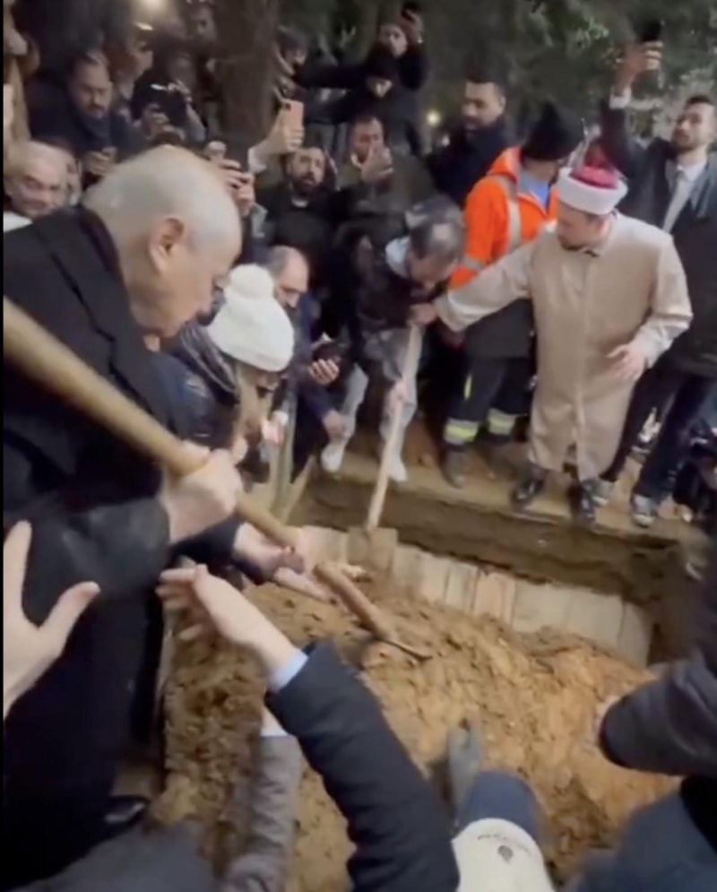 Ölümüyle Türkiye'yi yasa boğan Ferdi Tayfur, Yeniköy Mezarlığı'na defnedilirken, büyük üzüntü yaşayan Devlet Bahçeli, cenaze namazından sonra buraya da gelerek son görevini mezara toprak atarak gerçekleştirdi.