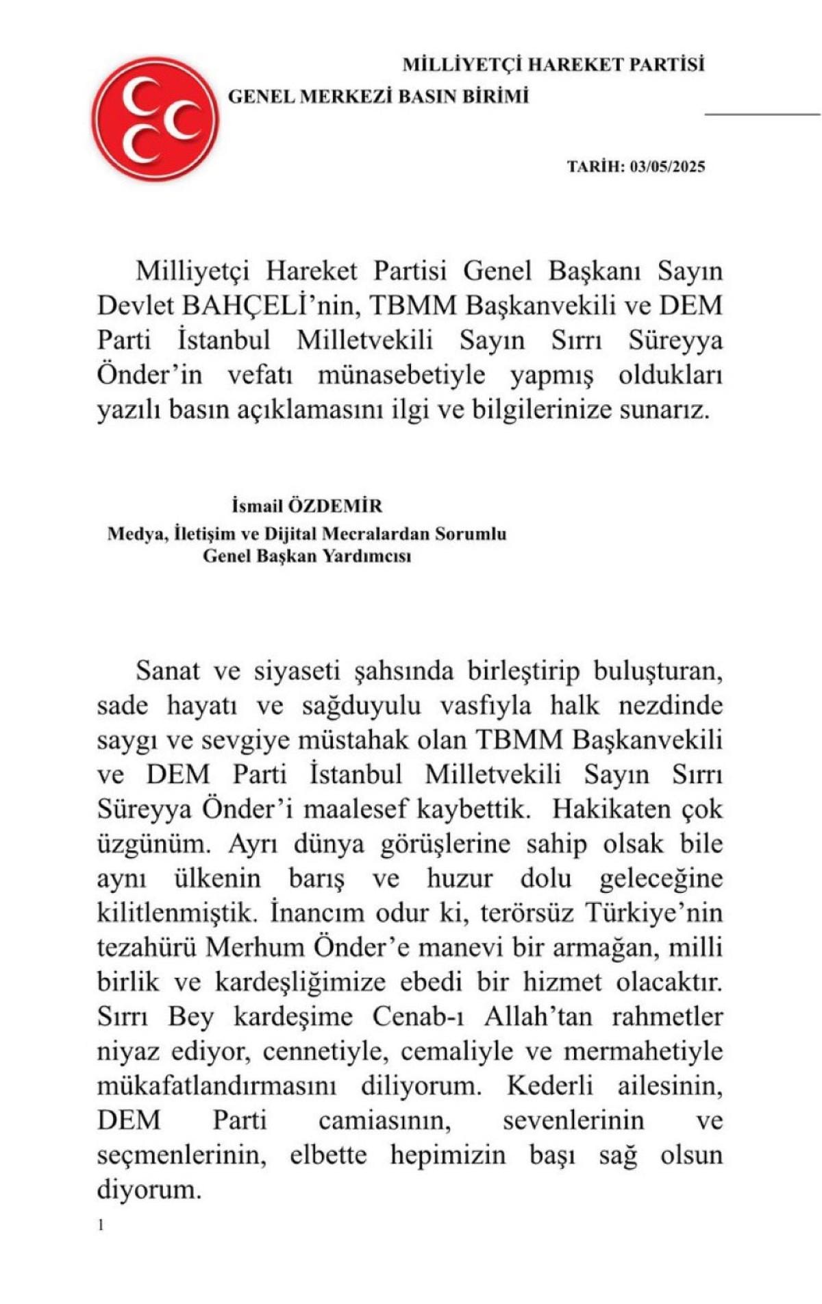 Sanat ve siyaseti şahsında birleştirip buluşturan, sade hayatı ve sağduyulu vasfıyla halk nezdinde saygı ve sevgiye müstahak olan TBMM Başkanvekili ve DEM Parti İstanbul Milletvekili Sayın Sırrı Süreyya Önder’i maalesef kaybettik.