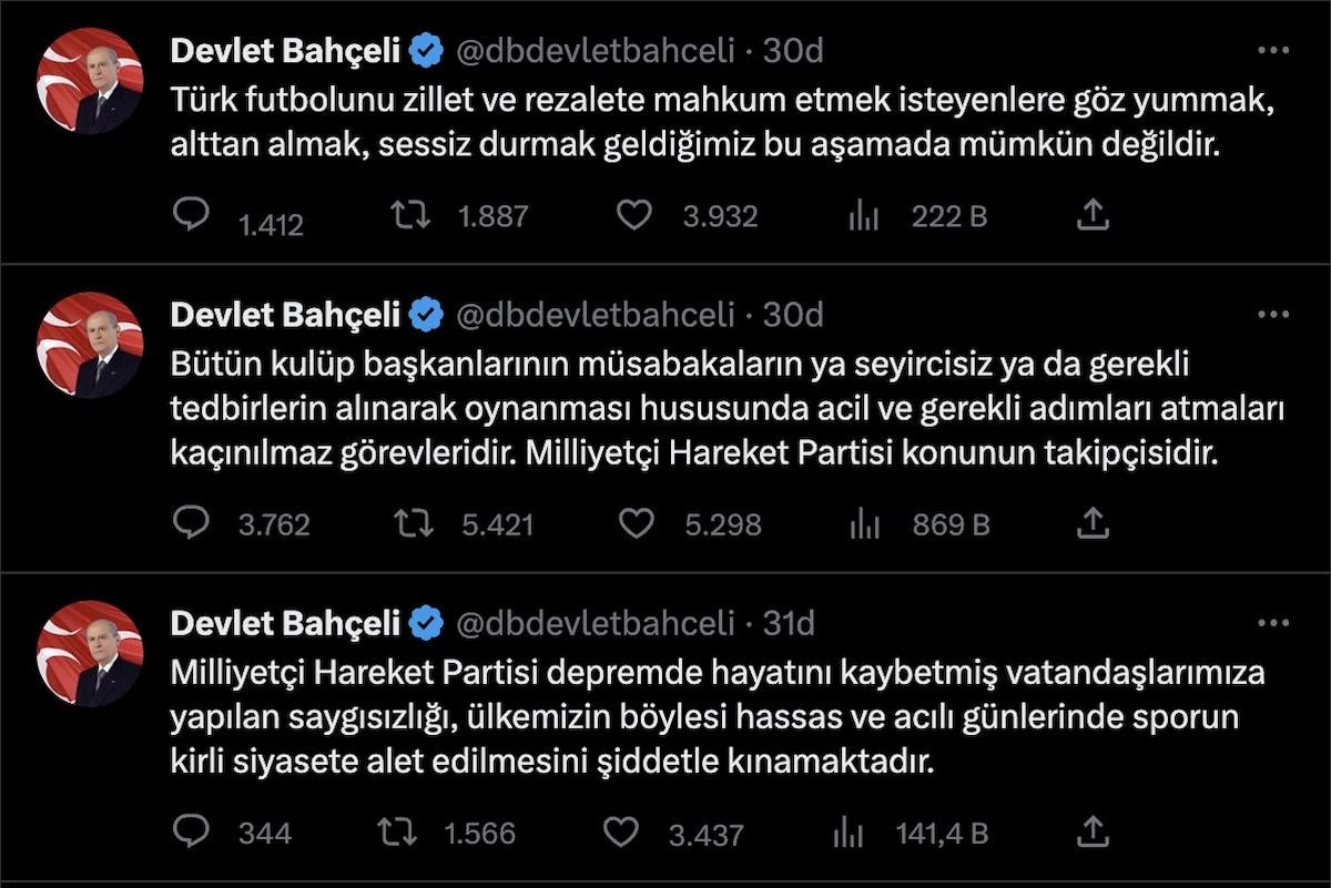 "Türkiye’miz son yüzyılın en büyük deprem felaketiyle mücadele halindeyken Fenerbahçe-Konyaspor futbol müsabakası esnasında trübünden istifa sloganlarının atılması sorumsuzluk ve şuursuzluktur. Bugün oynanacak Galatasaray-Alanyaspor ile Beşiktaş-Antalyaspor kulüpleri arasındaki müsabakalarda aynı şekilde istifa seslerinin yükselmesi halinde futbol kulüplerimizin oyuna geldiği, tuzağa düştüğü de netleşmiş olacaktır. Milliyetçi Hareket Partisi depremde hayatını kaybetmiş vatandaşlarımıza yapılan saygısızlığı, ülkemizin böylesi hassas ve acılı günlerinde sporun kirli siyasete alet edilmesini şiddetle kınamaktadır. Bütün kulüp başkanlarının müsabakaların ya seyircisiz ya da gerekli tedbirlerin alınarak oynanması hususunda acil ve gerekli adımları atmaları kaçınılmaz görevleridir. Milliyetçi Hareket Partisi konunun takipçisidir. Türk futbolunu zillet ve rezalete mahkum etmek isteyenlere göz yummak, alttan almak, sessiz durmak geldiğimiz bu aşamada mümkün değildir."