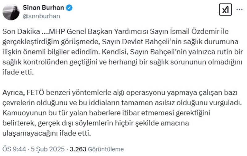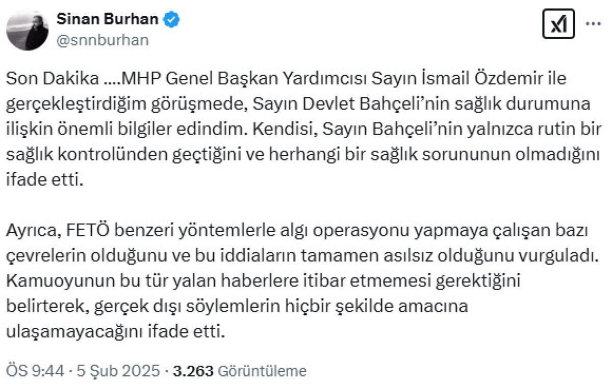 Gazeteci Sinan Burhan'a konuşan Özdemir, Bahçeli'nin herhangi bir sağlık sorununu olmadığını, sadece rutin sağlık kontrolünden geçtiğini açıkladı.