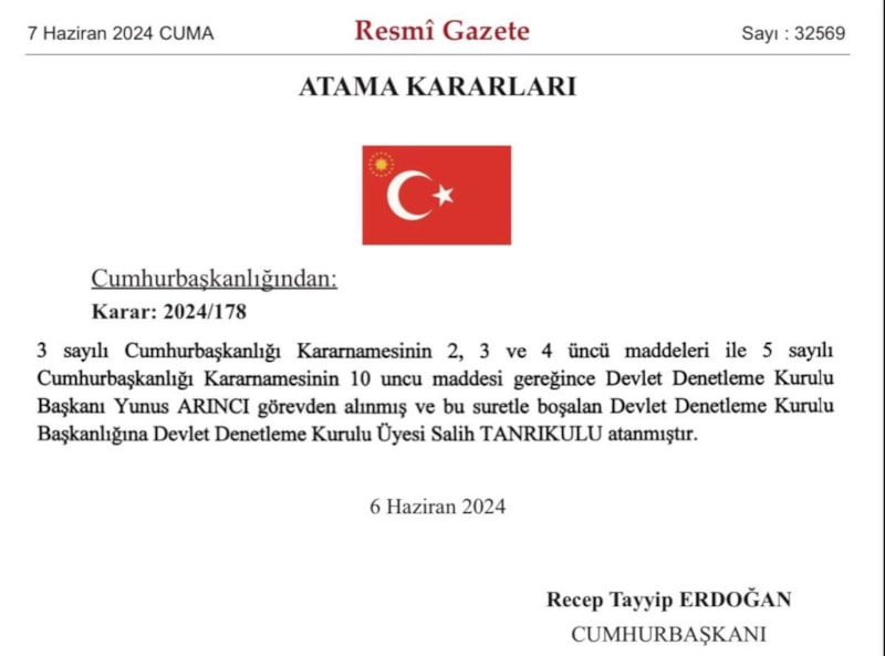 Resmi Gazete’de yayınlanan atama kararı doğrultusunda, Devlet Denetleme Kurulu Başkanı Yunus Arıncı görevden alındı. Yerine, kurul üyesi Salih Tanrıkulu atandı.