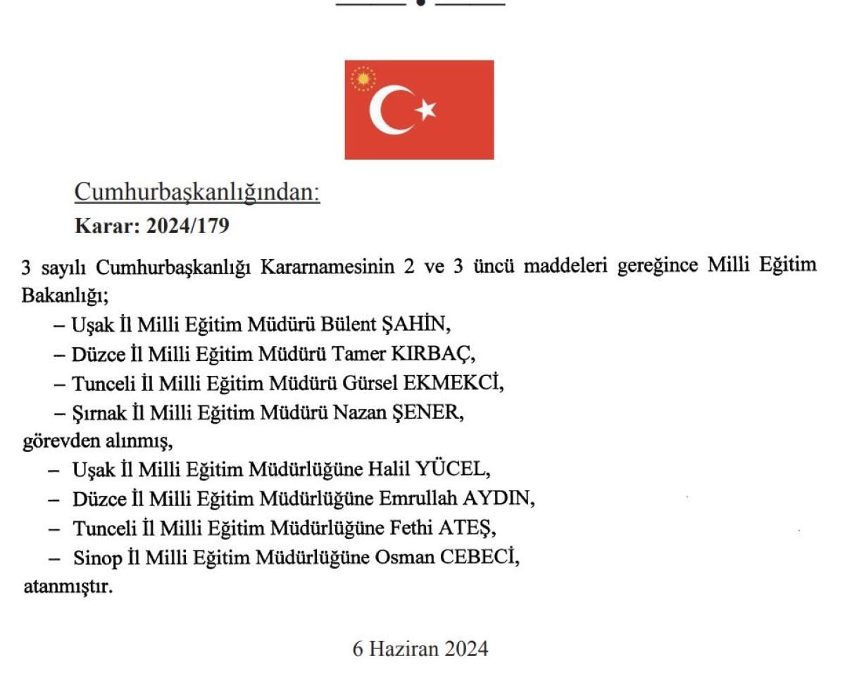 Kararda ayrıca Uşak, Düzce, Tunceli ve Şırnak İl Milli Eğitim Müdürleri'nin görevlerinden alınarak, yerlerine yeni müdürler atandığı da yer aldı.