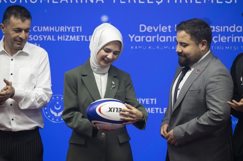 Törende, ragbi takımı antrenörü ve oyuncuları, Bakan Göktaş'a imzaladıkları ragbi topunu hediye ederken, konuşmaların ardından Bakan Göktaş, devlet korumasında yetişen ve atamada ismi yer alan bir gencin 6 aylık bebeğiyle atamanın gerçekleşmesi için butona bastı.