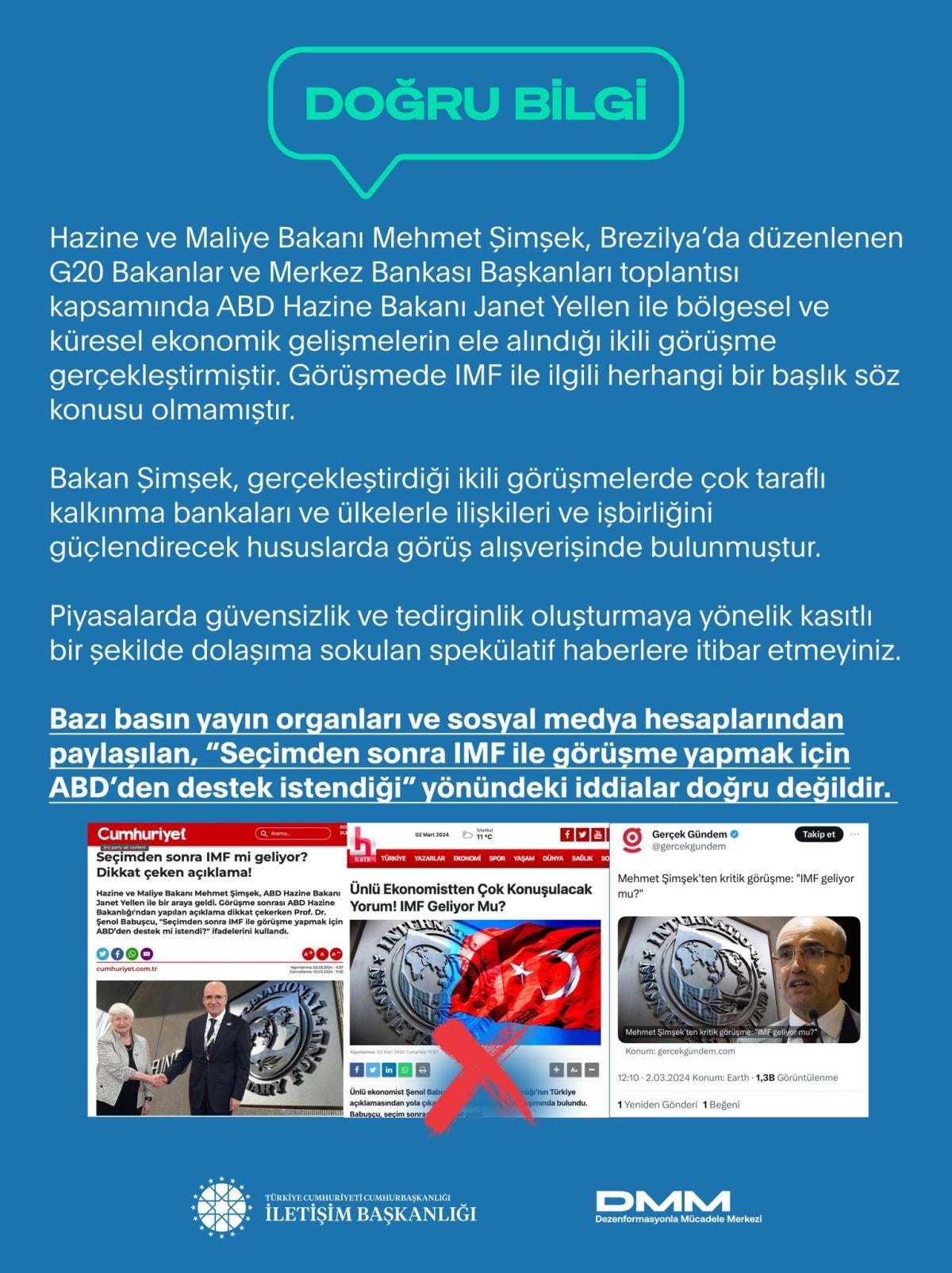 Bazı basın yayın organları ve sosyal medya hesaplarından paylaşılan, “Seçimden sonra IMF ile görüşme yapmak için ABD’den destek istendiği” yönündeki iddiaların doğru olmadığı belirtildi.
