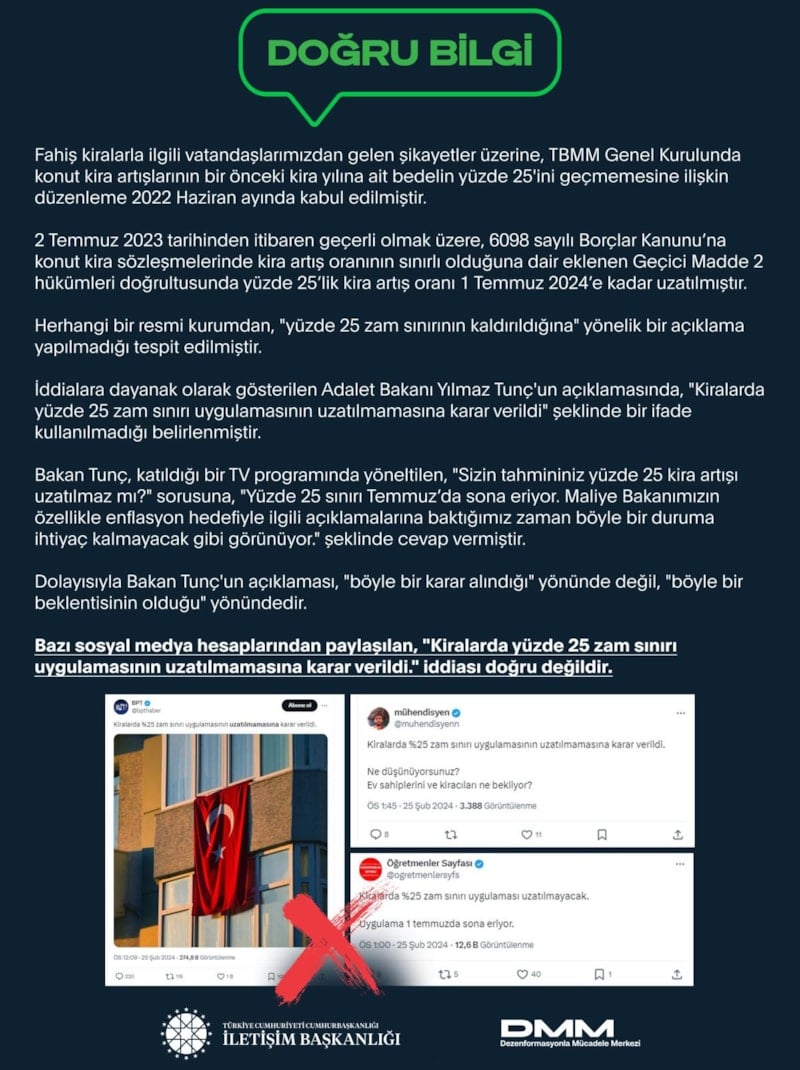 İletişim Başkanlığı Dezenformasyonla Mücadele Merkezi, kiralarla ilgili "yüzde 25" iddialarına yanıt verdi.