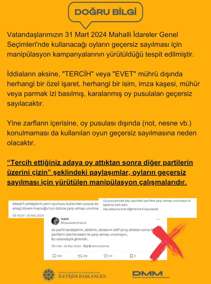 Dezenformasyonla Mücadele Merkezi, “Tercih ettiğiniz adaya oy attıktan sonra diğer partilerin üzerini çizin” şeklindeki paylaşımların oyların geçersiz sayılması için yürütülen manipülasyon çalışmaları olduğunu açıkladı.
