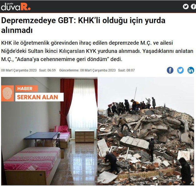 HAKİKAT: Haberde ismi geçen M.Ç. isimli şahıs, ailesi ile birlikte diğer tüm depremzedelerimiz gibi barınma/ konaklama müracaatlarının alındığı Niğde Gençlik ve Spor İl Müdürlüğü’ne bağlı Sultan 1. Kılıçarslan Yurdu’nda bulunan KYK görevlilerine 24 Şubat 2023 günü müracaatta bulunmuştur.