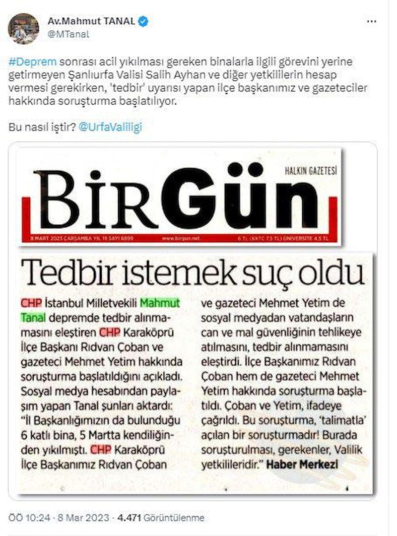 Bazı basın yayın organlarında, “Tedbir istemek suç oldu” başlıklı haberlerdeki, “Şanlıurfa’da hasarlı binalar için ‘tedbir’ uyarısı yapan iki kişi hakkında soruşturma başlatıldı” iddiası gerçeği yansıtmamaktadır.