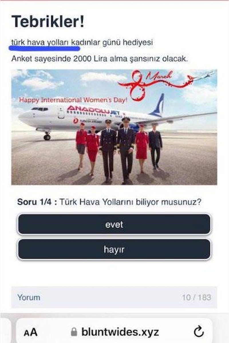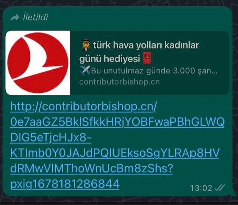 Bazı haberleşme uygulamalarında, “Türk Hava Yolları Kadınlar Günü Hediyesi” başlığıyla yapılan paylaşımlar, dolandırıcılık amaçlıdır.