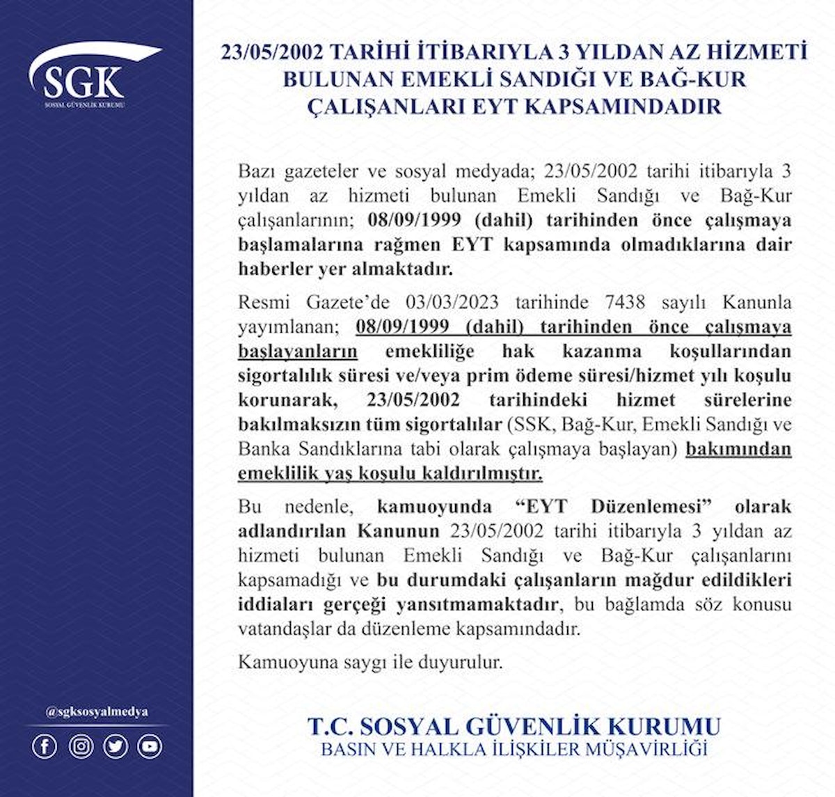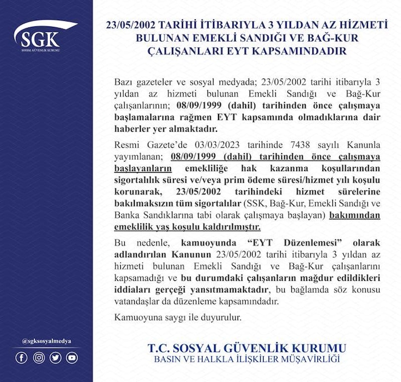 Emekli Sandığı'na bağlı çalışanların 23 Mayıs 2002’den önce, Bağ-Kurluların ise 1 Haziran 2002’den önce 3 yıl kesintisiz sigortalı çalışmış olması şartının getirildiği iddiası gerçeği yansıtmamakta olup, bu şartı sağlamayan vatandaşlar da EYT düzenlemesi kapsamındadır.