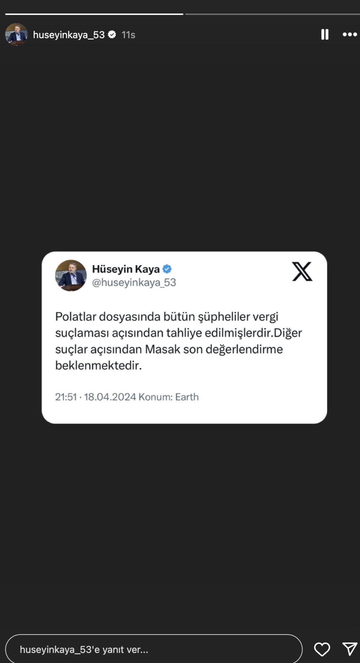 Kaya, hesabından yaptığı açıklamada, "Polatlar dosyasında bütün şüpheliler vergi suçlaması açısından tahliye edilmişlerdir. Diğer suçlar açısından MASAK son değerlendirme beklenmektedir." ifadelerine yer verdi.