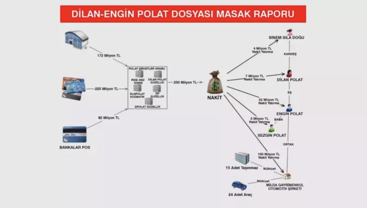 Polat çiftinin aile şirketlerindeki para hareketleri, 46 ilde açılan güzellik merkezleri, lüks araç alımları ve ürün satışları ele alındı.