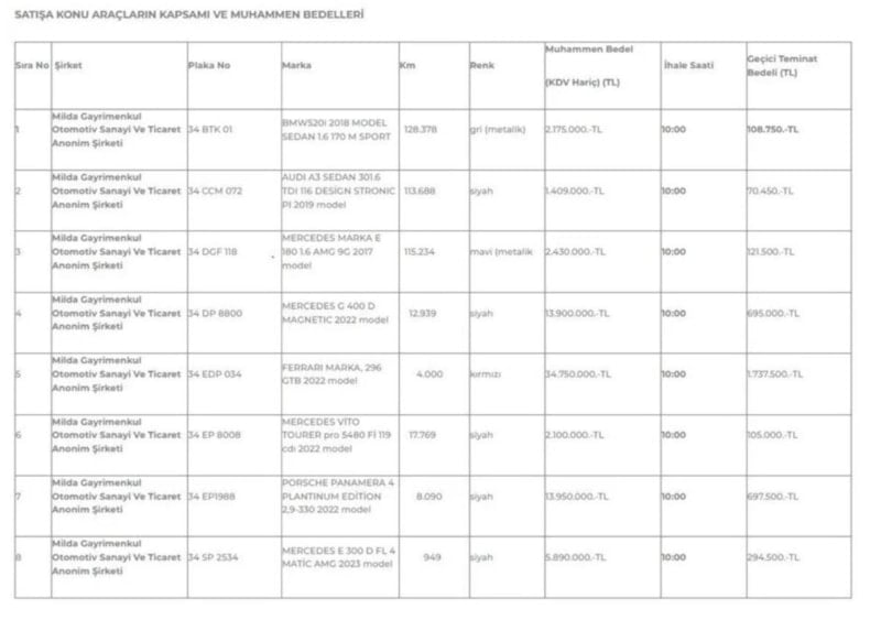 Dilan ve Engin Polat'ın sahibi olduğu Milda Gayrimenkul Otomotiv Anonim Şirketi'nin mülkiyetinde bulunan araçlar, açık ihale yöntemiyle satılacak.