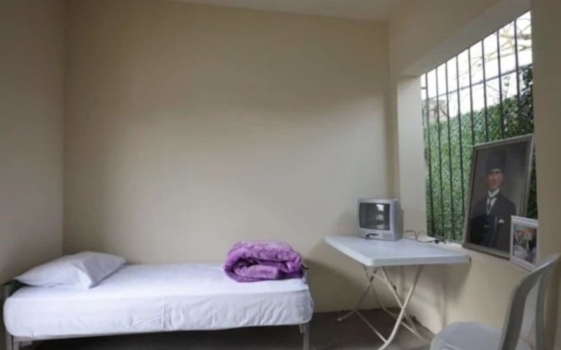 Sergilenen alanda, İmamoğlu’nun kaldığı hücreye benzer şekilde düzenlenen yaşam alanı yer alıyor.