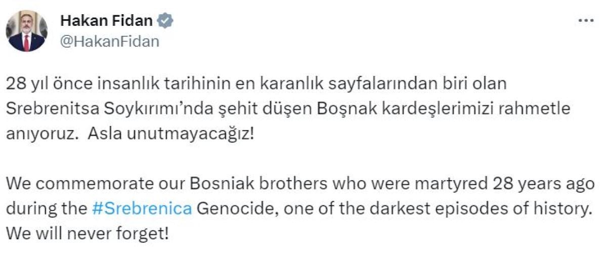 Bakan Fidan, söz konusu paylaşımını "Asla unutmayacağız!" ifadesiyle tamamladı.