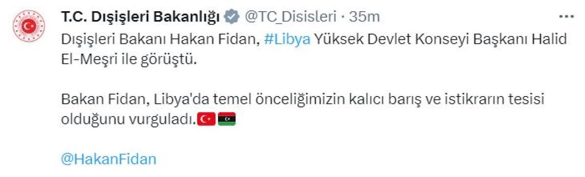 Dışişleri Bakanlığı'nın Twitter hesabından yapılan paylaşımda, Fidan ve Mişri'nin görüştüğü duyuruldu.