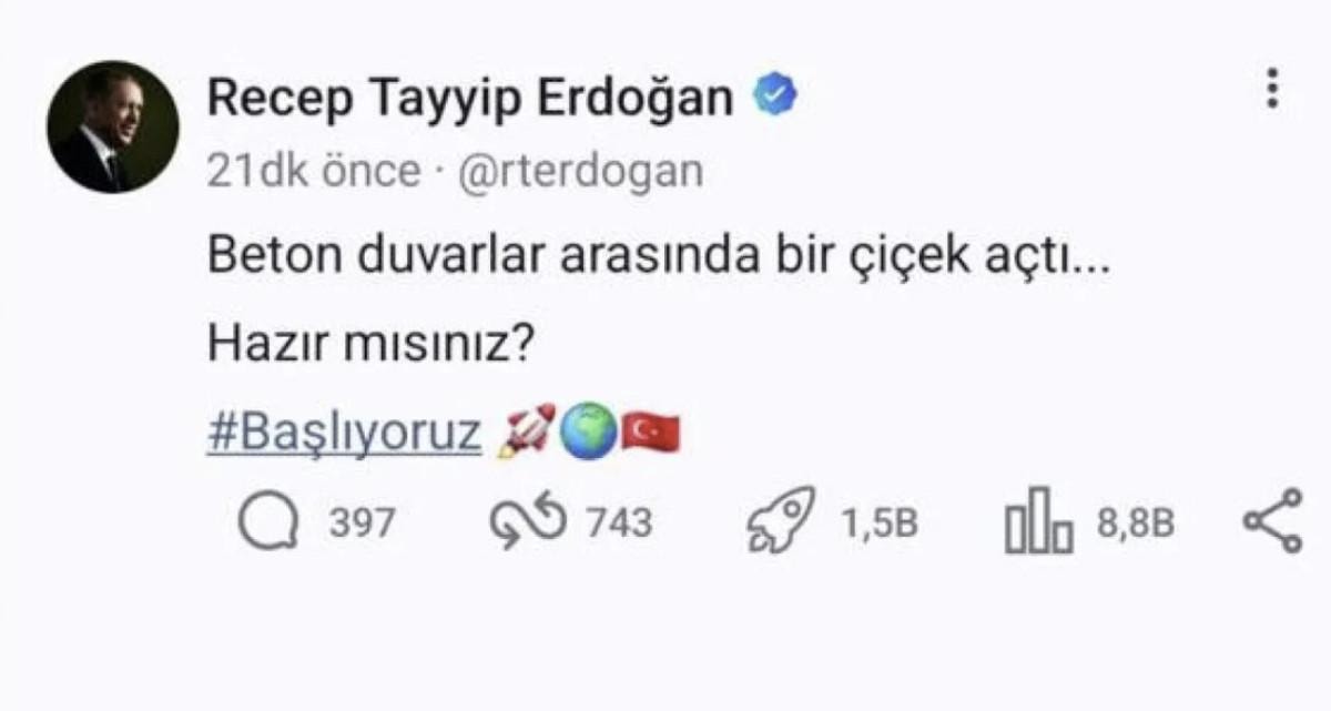 Cumhurbaşkanı Erdoğan'ın "Başlıyoruz" etiketli paylaşımında, Türk bayrağı, dünya ve roket emojileri de yer almıştı.