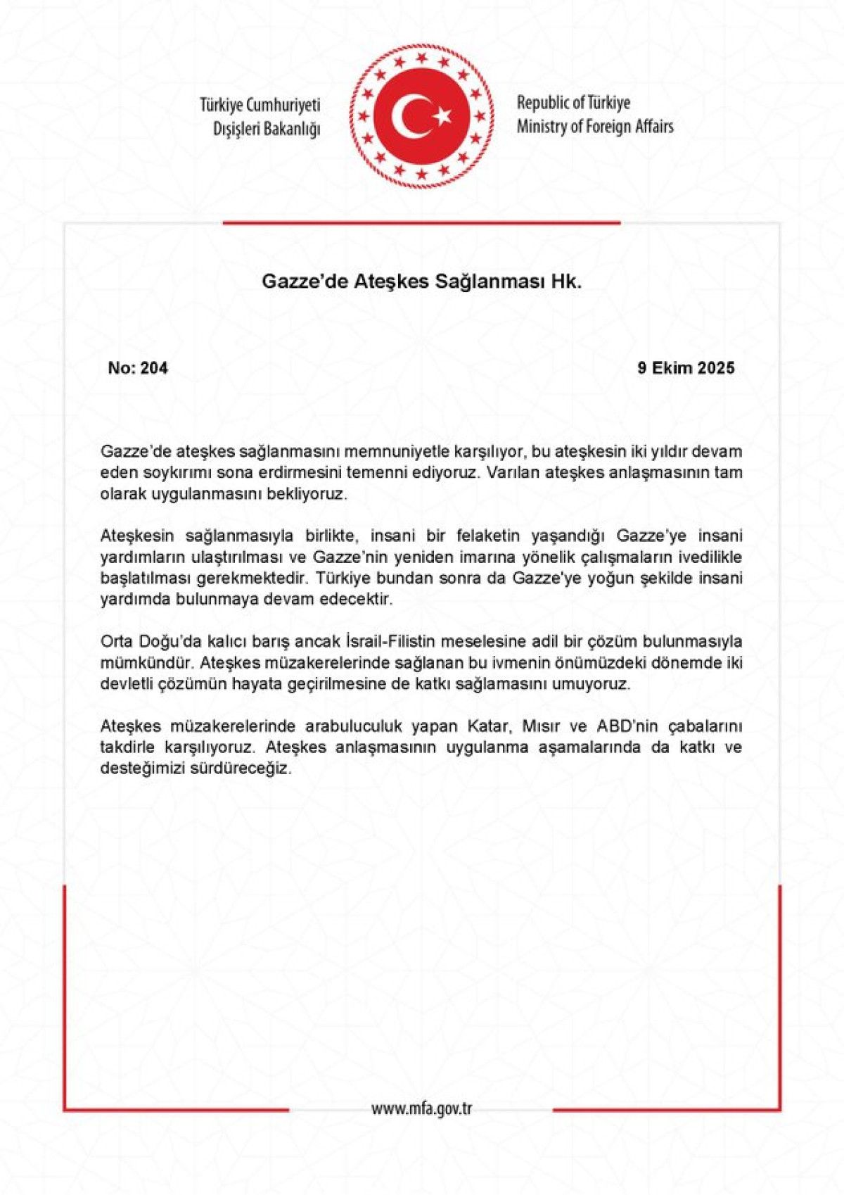 - Dışişleri Bakanlığı, Gazze'de ateşkesin sağlanmasını memnuniyetle karşıladığını açıkladı.