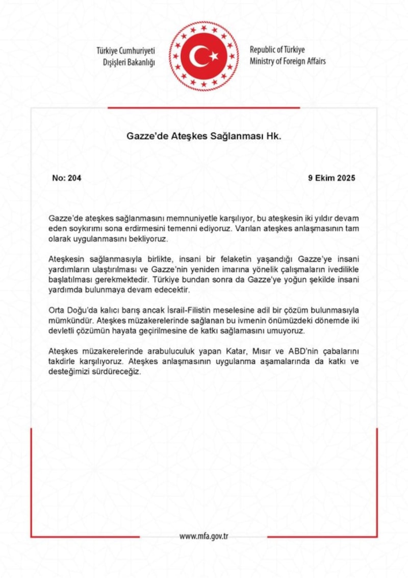 Dışişleri Bakanlığı'ndan yapılan açıklamada, "Gazze’de ateşkes sağlanmasını memnuniyetle karşılıyor, bu ateşkesin iki yıldır devam eden soykırımı sona erdirmesini temenni ediyoruz. Varılan ateşkes anlaşmasının tam olarak uygulanmasını bekliyoruz" dedi.