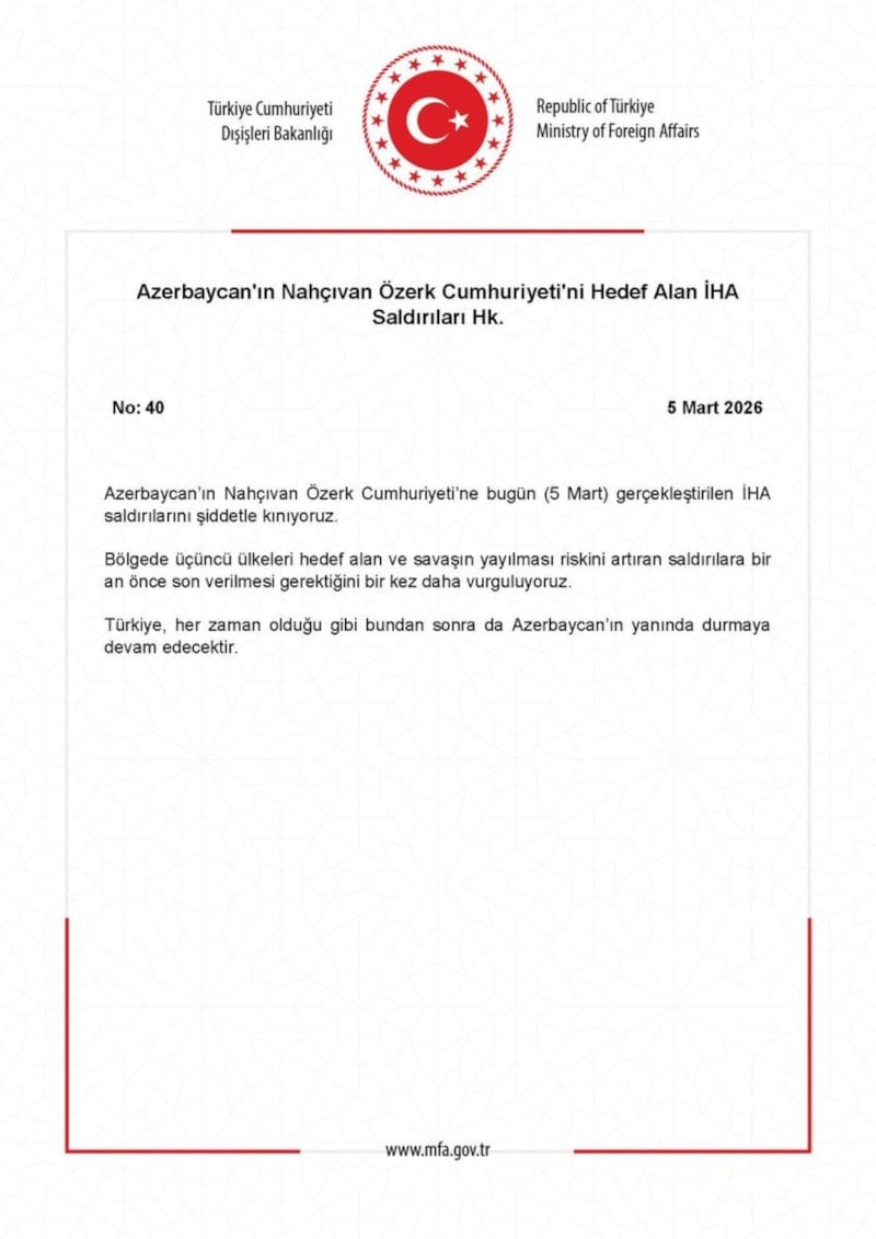 "Azerbaycan’ın Nahçıvan Özerk Cumhuriyeti’ne bugün gerçekleştirilen İHA saldırılarını şiddetle kınıyoruz." ifadesine yer verilen açıklamada, bölgede üçüncü ülkeleri hedef alan ve savaşın yayılması riskini artıran saldırılara bir an önce son verilmesi gerektiği bir kez daha vurgulandı.