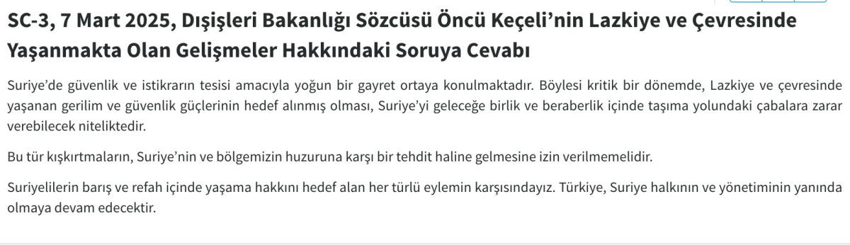 Suriye’de güvenlik ve istikrarın tesisi amacıyla yoğun bir gayret ortaya konulmaktadır. Böylesi kritik bir dönemde, Lazkiye ve çevresinde yaşanan gerilim ve güvenlik güçlerinin hedef alınmış olması, Suriye’yi geleceğe birlik ve beraberlik içinde taşıma yolundaki çabalara zarar verebilecek niteliktedir.