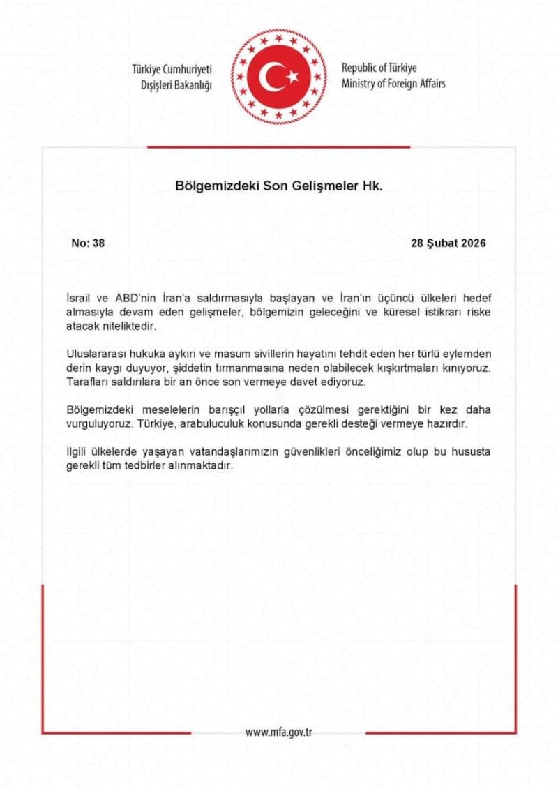 "İsrail ve ABD’nin İran’a saldırmasıyla başlayan ve İran’ın üçüncü ülkeleri hedef almasıyla devam eden gelişmeler, bölgemizin geleceğini ve küresel istikrarı riske atacak niteliktedir.