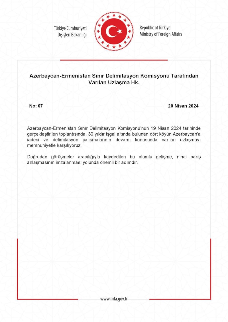 "Azerbaycan-Ermenistan Sınır Delimitasyon Komisyonu'nun 19 Nisan 2024 tarihinde gerçekleştirilen toplantısında, 30 yıldır işgal altında bulunan 4 köyün Azerbaycan'a iadesi ve delimitasyon çalışmalarının devamı konusunda varılan uzlaşmayı memnuniyetle karşılıyoruz. Doğrudan görüşmeler aracılığıyla kaydedilen bu olumlu gelişme, nihai barış anlaşmasının imzalanması yolunda önemli bir adımdır."