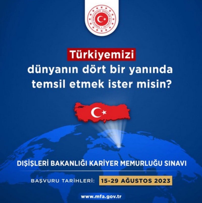 Dışişleri Bakanlığı'nın sosyal medya hesabından, 'Türkiyemizi dünyanın dört bir yanında temsil etmek ister misin?' başlığı altında diplomat alımına dair ilan yayımlandı.