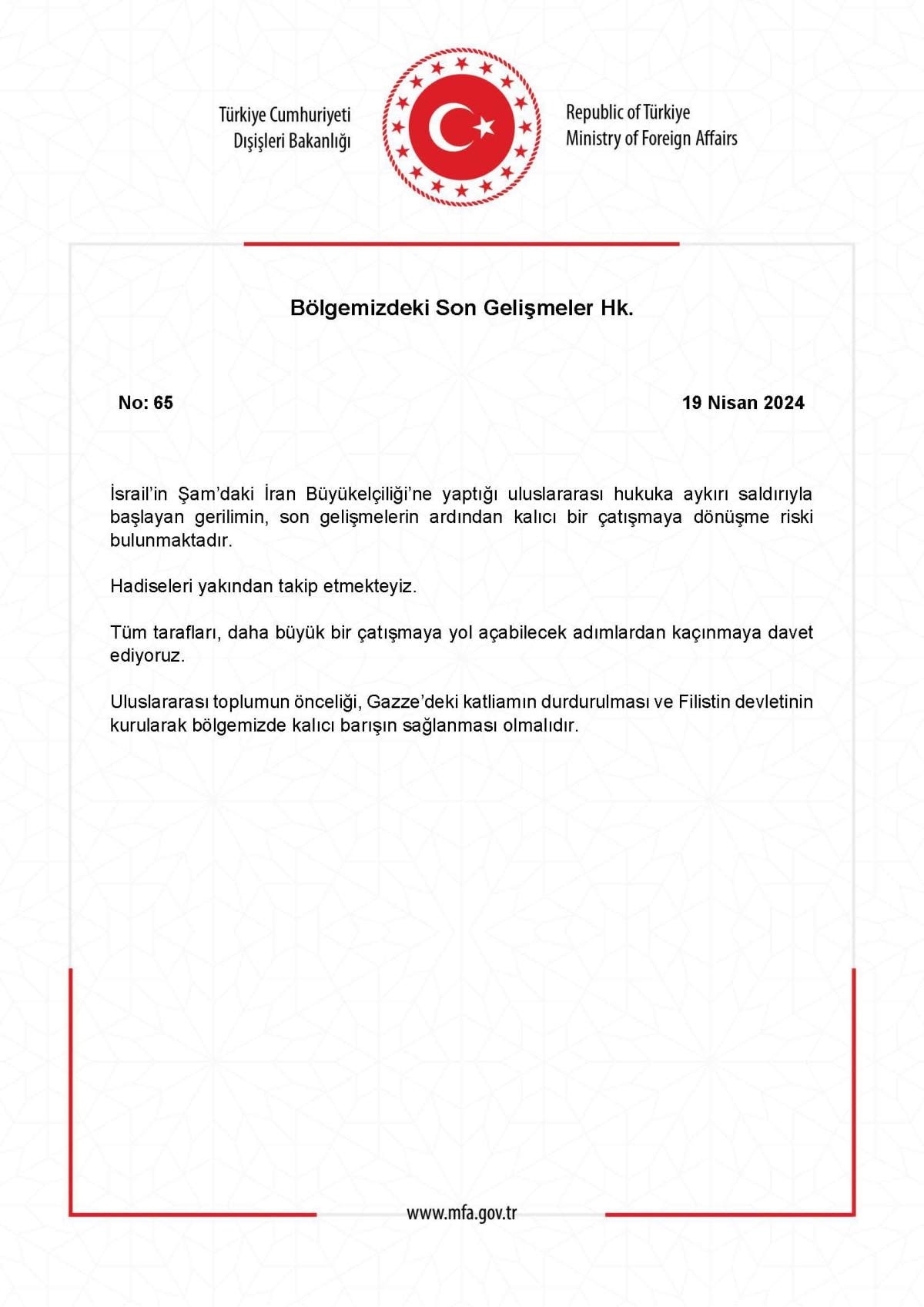 Dışişleri Bakanlığı, "Bölgemizdeki son gelişmeler hakkında" başlıklı paylaşımında şu ifadelere yer verdi;
