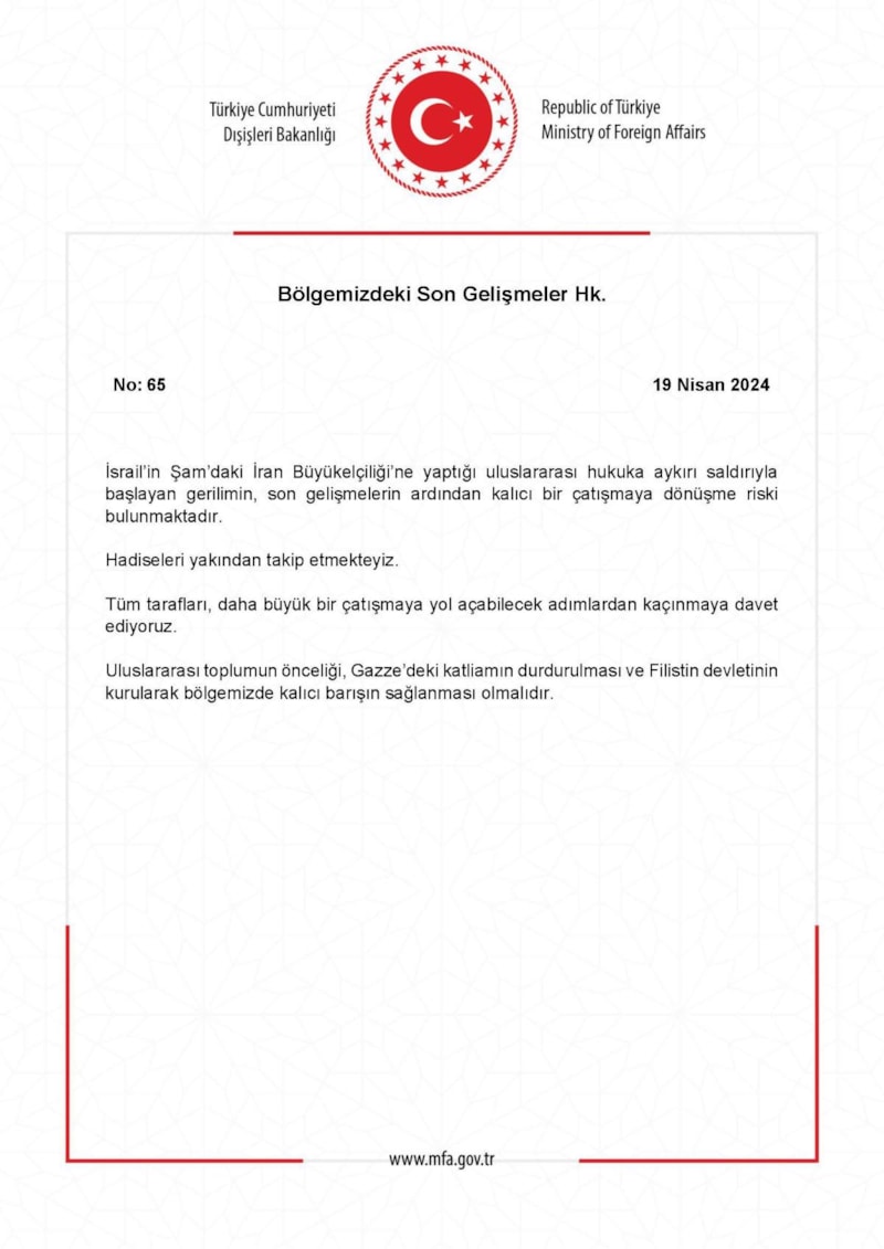 İsrail-İran gerilimine ilişkin Dışişleri Bakanlığı'ndan yapılan açıklamada, "Hadiseleri yakından takip etmekteyiz" ifadelerine yer verildi.
