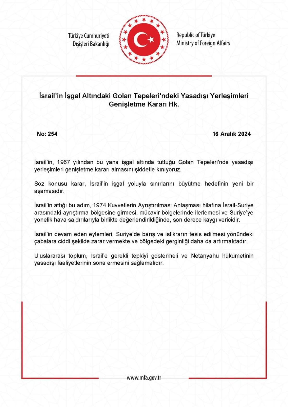 "İsrail’in, 1967 yılından bu yana işgal altında tuttuğu Golan Tepeleri’nde yasadışı yerleşimleri genişletme kararı almasını şiddetle kınıyoruz." sözleriyle başlayan açıklamada şu ifadeler yer aldı: