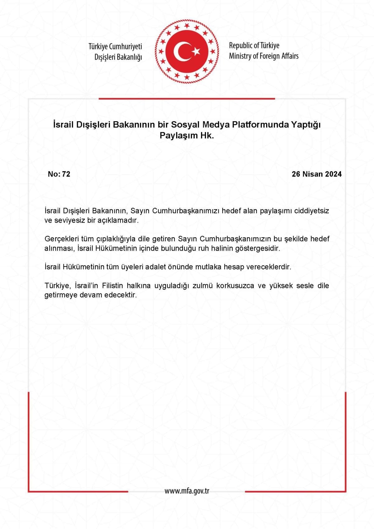 "İsrail Dışişleri Bakanının, Sayın Cumhurbaşkanımızı hedef alan paylaşımı ciddiyetsiz ve seviyesiz bir açıklamadır.