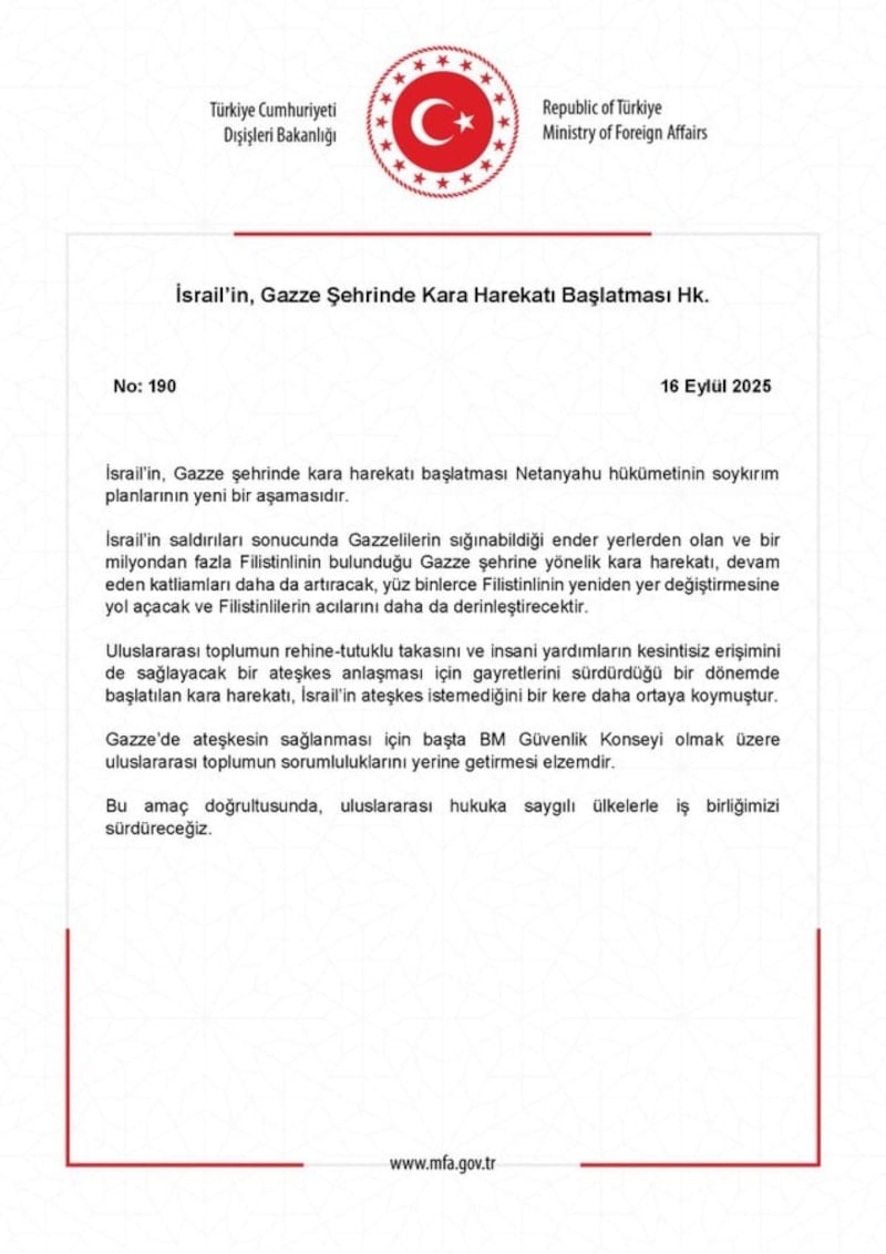 Dışişleri Bakanlığı, İsrail'in Gazze'de kara harekatı başlatmasını sert bir dille tepki gösterdi. Bakanlık, Gazze'ye yönelik bu adımı "Netanyahu hükümetinin soykırım planlarının yeni bir aşaması" olarak değerlendirdi.